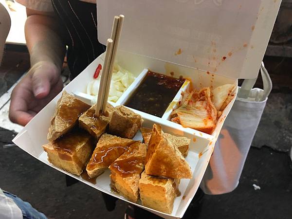 金黃酥脆外皮的臭豆腐、內部柔嫩,搭配韓式與台式泡菜,兩款泡菜無特別驚艷,但臭豆腐沾特製焦糖色醬汁很好吃。